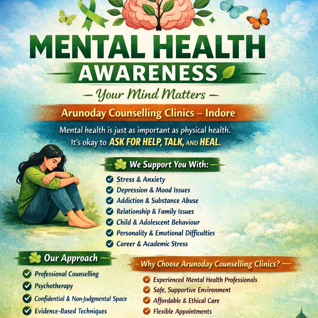 ARUNODAY COUNSELLING CLINIC – INDORE Trusted Care for Your Mental Well-being At Arunoday Counselling Clinic, we believe that trust is built through understanding, confidentiality, and consistent care. For the past 10+ years, we have been helping individuals, couples, and families lead healthier and happier lives. Why Clients Trust Us: ✔ Professional & experienced counselling psychologist ✔ Safe, confidential & non-judgmental environment ✔ Personalized therapy plans for every individual ✔ Proven psychotherapy & counselling techniques ✔ Compassionate listening and practical guidance Our Services: • Marital & Pre-marital Counselling • Teen & Child Counselling • Stress & Anxiety Management • Depression & Emotional Support • Personality & Behavioral Issues • Mental Health Therapy (Mild to Severe Cases) • Old Age Counselling Special Guidance Available For: • Relationship issues • Career confusion & life decisions • Emotional imbalance • Self-growth & confidence building Internship Programs Available (For psychology students & beginners – practical learning with real case exposure) Your Mental Health Matters Take the first step towards healing with trusted care. 📍 Indore 📞 Contact Now for Appointment Arunoday Counselling Clinic – Where Trust Meets Care